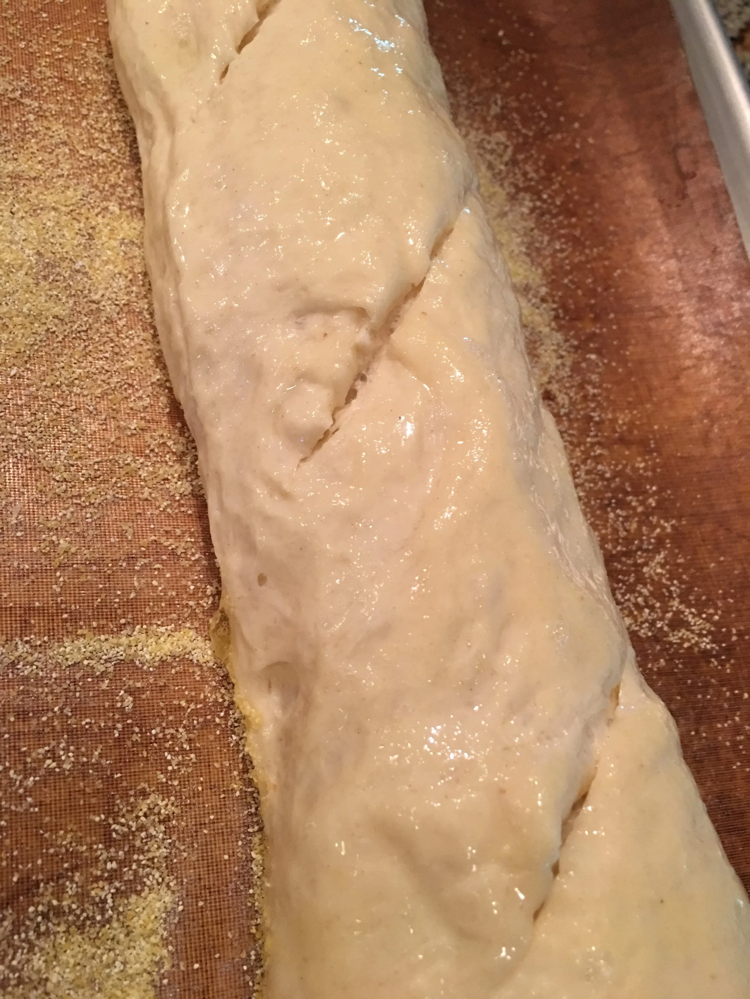 Turn the dough out onto a floured work surface. Shape the dough into baguettes by dividing the dough into 4 equal portions. Flatten each into a thin 10 x 5 inch rectangle using the palm of your hand. Starting at the long end, tightly roll the dough using your thumbs to guide you all the way down the loaf. Keep rolling until all the dough is rolled into a baguette shape. Tuck the ends under and place the dough seam side down on parchment that has been sprinkled with cornmeal. Once all loaves are formed, cover them loosely with either a towel or plastic wrap and let them rest at room temperature until tripled in bulk, approximately 1 hour and 15 minutes.